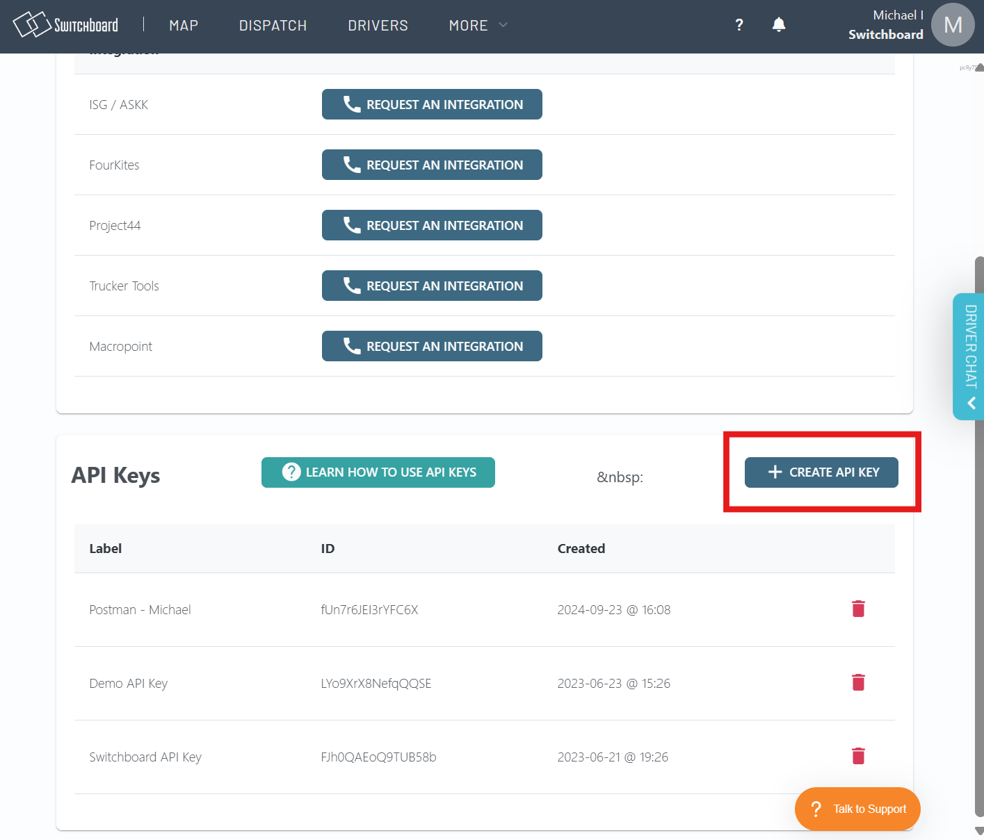 You can generate API Keys for custom integrations to access Switchboard data on vehicles, drivers, and more.